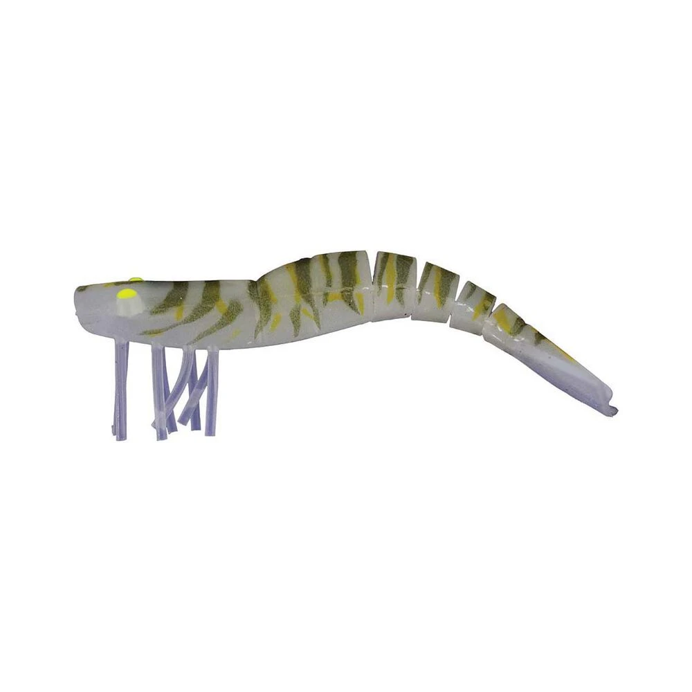The live shrimp can be rigged on weedless worm hooks or on a conventional jig head for open area fishing and the lumo eyes and segmented tail provide even further attraction while this lure is being used.